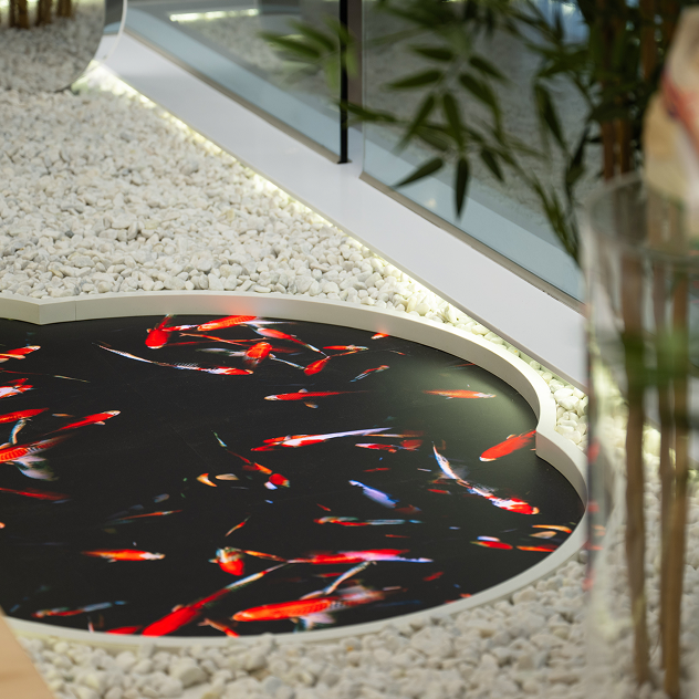 The Koi Pond Floor: One of the store’s most captivating features is an LED floor simulating a tranquil koi pond. This "window to the water" adds a layer of theatrical movement that stops shoppers in their tracks.